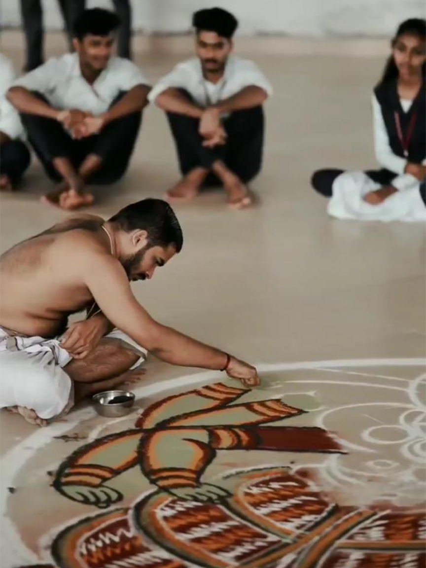 On August 29, 2022, under the leadership of the Thani Malayalam Club, Kerala Folklore and Temple Arts Academy Artist organized a cultural event where students were introduced to the art of Kalamezhuthupaat and traditional Kerala dance forms by renowned artists Shri Kadannamanna Srinivasan. The aim was to familiarize students with the art of Kalamezhuthupaat and traditional dance forms as part of their cultural education. Students, who were members of the Thani Malayalam Club, actively participated in the event. The event included performances such as Panchadooli (a traditional martial art form), Nanthuni (a traditional musical instrument), and praise songs, which mesmerized the students. After Shri Srinivasan’s performance, he provided a brief explanation about the art form, its tools, and the background, enlightening the students.